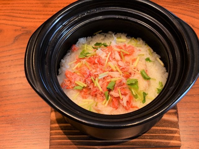 カニ、カキ、牛肉など、季節替わりの具材で土鍋ご飯を味わえる。写真上は本日の土鍋ご飯から「蟹の炊き込みご飯」を。もっちりと炊きあがったコシヒカリの上にほぐしたカニの身がたっぷり乗り、ふわりと広がるだしの香りが〆にもちょうどよい。