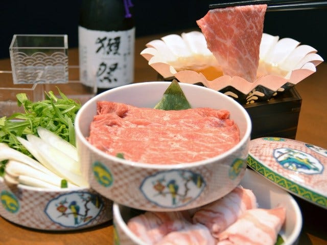 この流通量の少ない肉を使った「出汁しゃぶ」(写真上)が看板メニュー。しゃぶしゃぶというと、ポン酢やゴマダレに付けて食べるのが一般的だが、同店では、だしそのものを味わうためにすでに味を調えた状態で提供される。二種の宗田節と鯖節、長崎産いりこ、焼きあご、天然日高昆布、香味野菜をじっくりと時間をかけて煮出しているので、とても濃密で均整のとれた味わいが特徴だ。