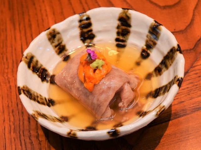 「上にのったウニはおまけです」と料理長の山本さんは言うが、とんでもない。実はこのウニ、日本一との呼び声も高い北海道厚岸郡浜中町を拠点とする霧多布(きりたっぷ)で採れたものなのだ。天然昆布や海藻を食べて育ち、ぷりっとした身は存在感があり、甘みはぎゅっと凝縮され、それはもう絶品の一言。石垣牛の赤身にも負けない濃厚さだ。