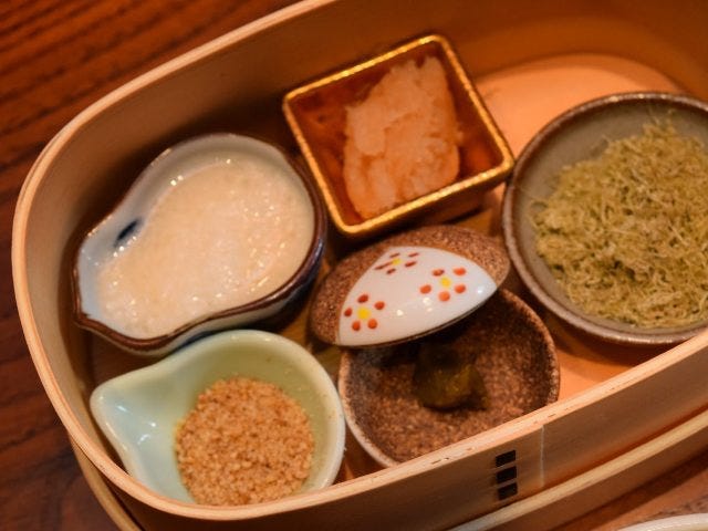 一緒に添えられた七種の薬味(柚子胡椒、梅おろし、とろろこんぶ、いりごま、とろろ、黒七味、ネギ)を好みで加え、素材同士の融合を楽しめばさらに食も進む。〆に雑炊はもちろんだが、だしで炊いた土鍋ご飯も捨てがたい。