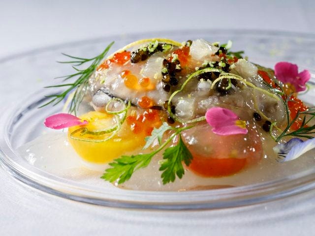 前菜より「北海道産昆布牡蠣」(写真上)。牡蠣を細い火で20分ほどゆっくり煮る。つまり牡蠣からでるだしで牡蠣を煮ているのである。火が入ったところで牡蠣を取り出し、そのだしにゼラチンを入れ冷めたところにウォッカをたっぷり。牡蠣は生牡蠣と思えるほどプリップリで白子と同じ、いやそれ以上にミルキー。ポイントはかなりの量をぎゅっと搾ったライムとレモン。酸味がウォッカと相まって最高のハーモニーを奏でる。そこに根セロリのピューレとキャビアの塩気が重なれば極上の皿となる。