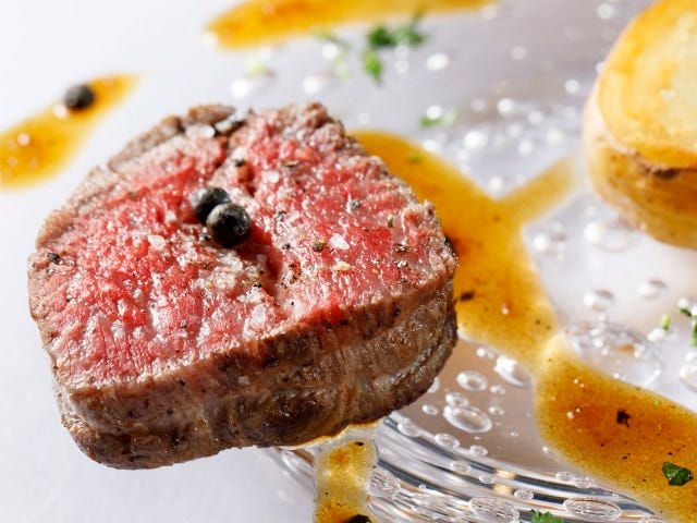 メインの肉料理は表面だけをかっちり焼き、中は非常にやわらかい仙台の「漢方牛」(写真上)。フィレとはいえA4~A5クラスの肉は脂がのっているので、やや強めに塩コショウを振るだけで十分においしい。焼いては休ませながらゆっくりと火を入れていく。ナイフで切る必要がないくらい歯切れが良い。そして口の中でじんわりと肉のうまみが広がってくる。一度食べたら忘れられない質の良さだ。生の黒胡椒ソースは肉の味を邪魔せずに香りと風味だけを重ねている。