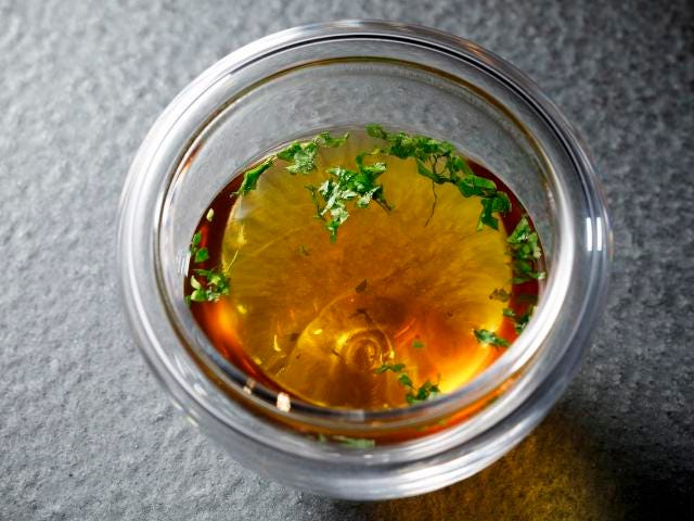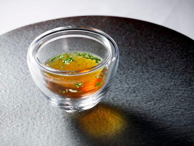 アミューズの「コンソメスープ」(写真上)。まずはこの香りを楽しみたい。美しいこの黄金色は肉からでる色だけでできたものだ。