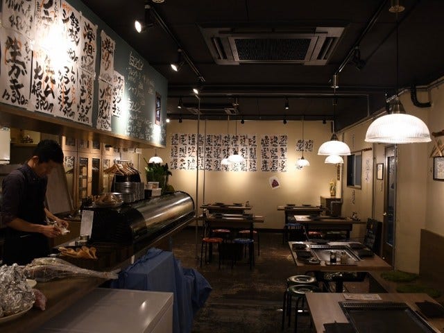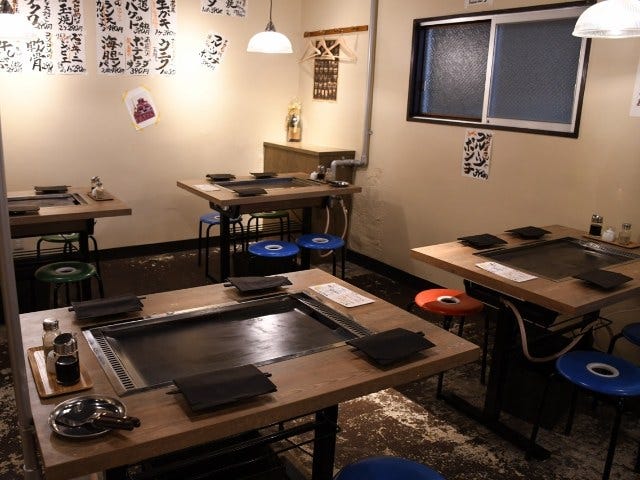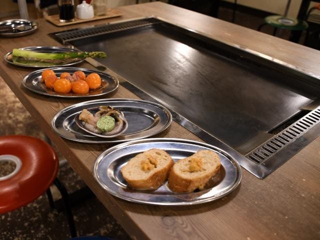 灯りが漏れる扉を開くと、鉄板を備えたテーブルが整然と並んでいる。鉄板ビストロと聞いて、カウンターを思い浮かべた方も多いと思うが、こちらの鉄板はお客同士で囲むスタイルで、一見「お好み焼き屋」のよう。そう、まさにそのイメージこそがオーナーの狙いである。