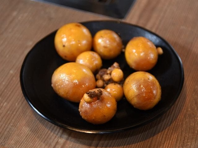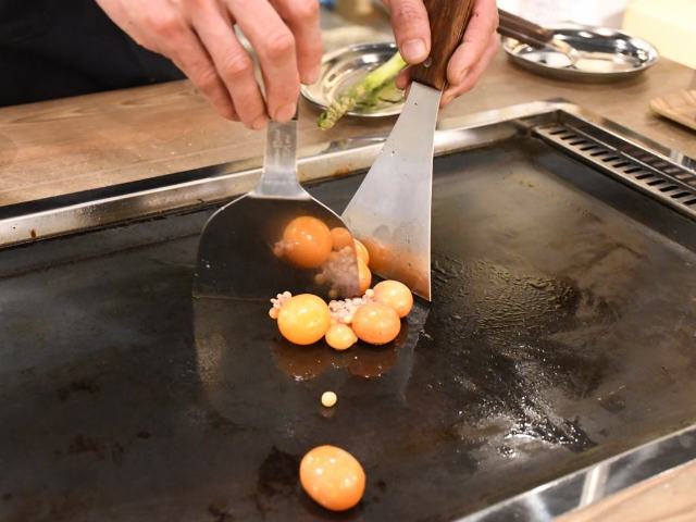 これを鉄板に広げ、コテでコロコロと追い回すように焼く。味付けは塩胡椒のみ。濃厚な卵黄のコクを引き立てるには、これぐらいのシンプルさがちょうどよい。レア気味に焼かれたちょうちんは、通常の卵黄より水分量が少なく、口内にねっとりと絡みつき、凝縮されたうまみを存分に楽しめる。