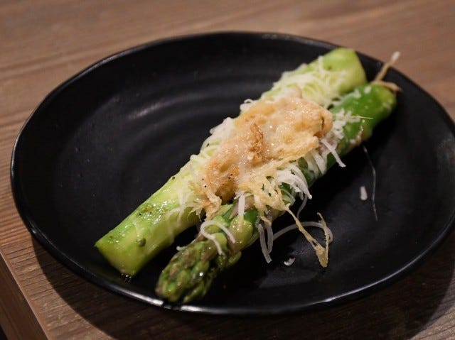 伊藤さんが白ワインとのマリアージュに太鼓判を押すのが「アスパラ パルミジャーノ削って」(写真上)。アスパラは鮮度が落ちやすい野菜の代表格だが、そこは階下の市場が頼りになる。みずみずしいアスパラを鉄板で焼き、最後にイタリアが世界に誇る硬質チーズ「パルミジャーノ・レッジャーノ」を目の前で削って仕上げてくれる。鉄板に落下したチーズは液状化し、しばらくするとフツフツと沸騰し始める。周りが色づいたら引き上げ時。皿に載せてしばらくするとパリパリのパルミジャーノせんべいに早変わり。これまた白ワインが進んで仕方がない。