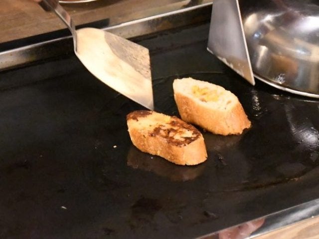 女性からの支持が高いメニューに「海胆(ウニ)パン」(写真上)がある。ウニを乗せたブルスケッタ風の料理かと思いきや、ペースト状にしたウニを卵液に入れ、そこへバゲットを浸してフレンチトーストの様に焼き上げる。均一に火が回る鉄板と蓋をうまく利用することで、表面はこんがり、中心部はしっとり。これには白ワインが進んで仕方がない。2枚で490円というリーズナブルさもうれしい限りだ。