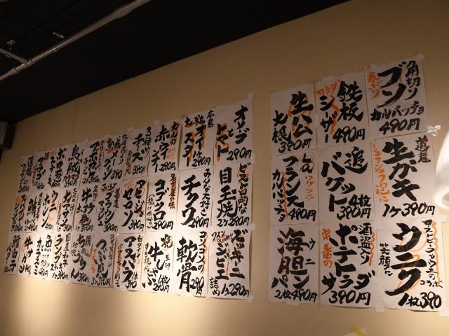 メニューは壁面にペタペタと貼られた書道半紙。新しい料理が誕生したら貼り出し、旬が終われば撤去するフレキシブルさで、メニューは目まぐるしく変化する。中には見ただけでは想像がつかないメニューも。