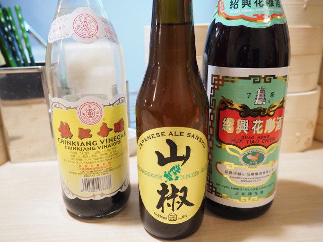 ドリンクは発泡ワインやウーロン茶などがあるが、ぜひ試してもらいたいのが岩手産クラフトビールの「山椒ビール」(写真上・中央)。山椒のスパイシーな香りはありつつも、上品な後味で担担麺にベストマッチする。