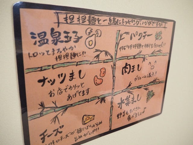 好みに応じて温泉玉子やパクチー、挽き肉、ナッツなどのトッピングを増やすこともできる(写真上)。また、味をカスタマイズしたいお客用に「花椒三種盛」というシビれの極みともいえるメニューもお目見えする。