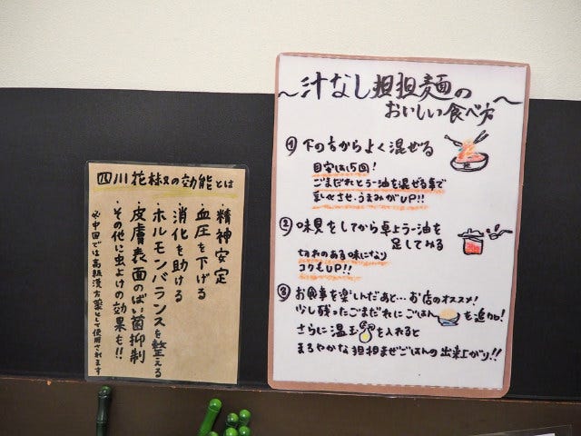 メニューは基本的に「担担麺(汁なし)」と「担担麺(汁あり)」の2種類。その他、ディナータイムにはおつまみの小籠包と焼売がある。担担麺については「シビれない」「シビれる」「すごくシビれる」の3種類の“しびれ度合い”を選ぶスタイルだ。