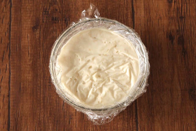 ④ ホワイトソースを耐熱ボウルなどに移し、ラップをぴったりと張って水分の蒸発を防ぐ。マカロニは指定の時間通りに茹でておく。