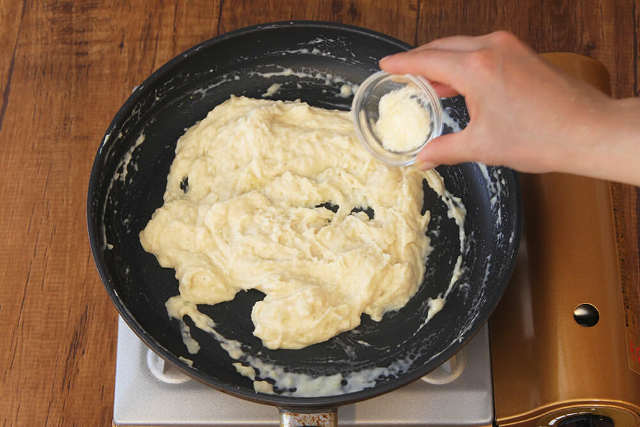 完成したホワイトソースに、粉チーズを少量加える。このひと手間で、チーズの香りと塩気がホワイトソースに加わるのはもちろんのこと、溶けたチーズ特有の「とろみ」がホワイトソースに加わり、より濃厚な口当たりになる。