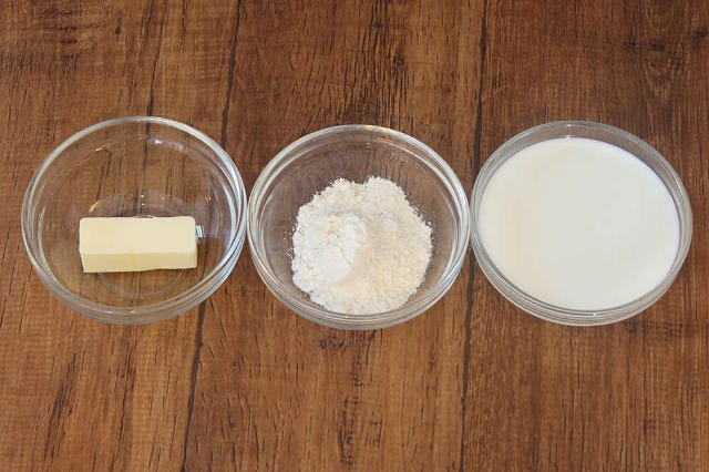 ホワイトソースに欠かせない材料であるバター、小麦粉、牛乳の比率は「1:1:15」。この比率で作れば、バターの風味が心地よく感じられる、濃厚でクリーミーなホワイトソースに仕上がる。