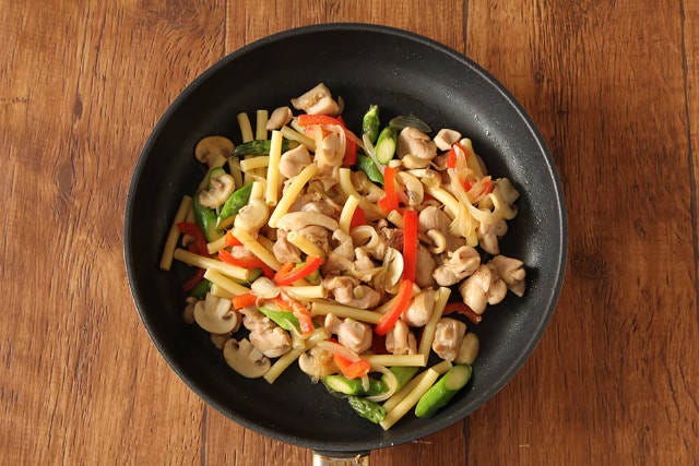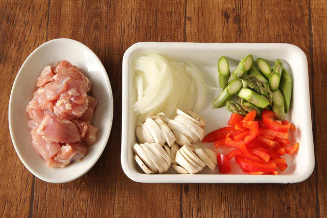 ⑥ タマネギは薄切り、マッシュルームは5mm幅に切る。アスパラガスは下の固い部分を切り落とし、2cmの長さに斜めに切る。赤パプリカは5mm幅に切る。鶏もも肉は皮をとり、ひと口大の大きさにきる。