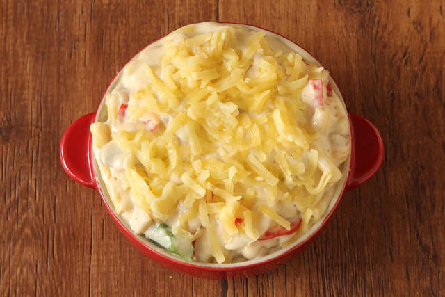 ⑧ ④のホワイトソースを⑦に加えて中火にかける。沸々してきたら火を止める。グラタン皿に入れ、シュレッドチーズをかける。