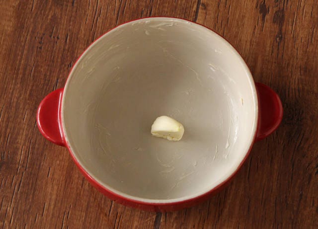 ⑤ グラタン皿2枚の内側にバターを薄く塗り、ニンニクの断面をこすって香りをつける。