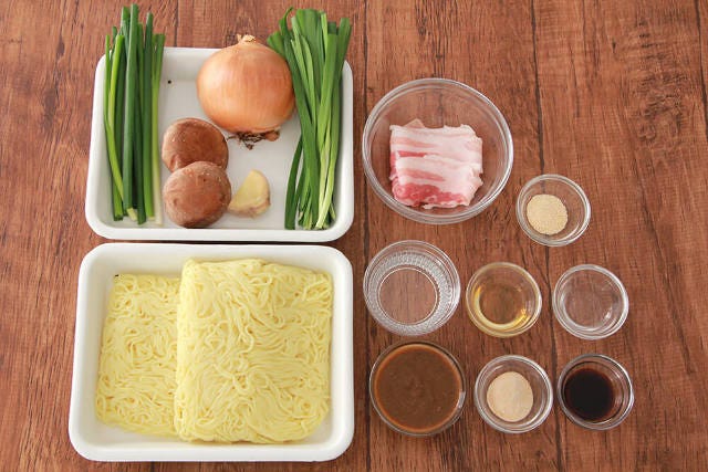③ フライパンにゴマ油を熱し、豚バラ肉、ショウガ、タマネギ、シイタケの順に炒め、中華麺を加えて麺を焼き付けるように強火で炒め合わせる。
