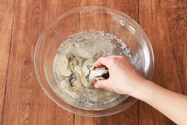 ① 牡蠣は3%の塩水(分量外・水1000ccに塩約30g)に入れ、水の中で振るようにして洗う。