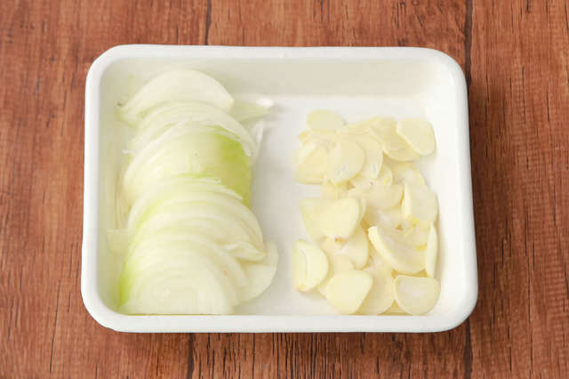 ③ ニンニク、タマネギは2~3mm幅にスライスする。
