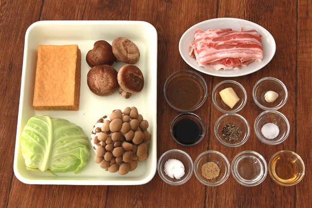 ① ニンニク、ショウガはみじん切りにする。シメジは小房に分ける。シイタケはスライスする。キャベツはざく切りにする。厚揚げは油抜きをし、8等分に切る。豚バラ肉は3cm幅に切る。Aを混ぜ合わせておく。