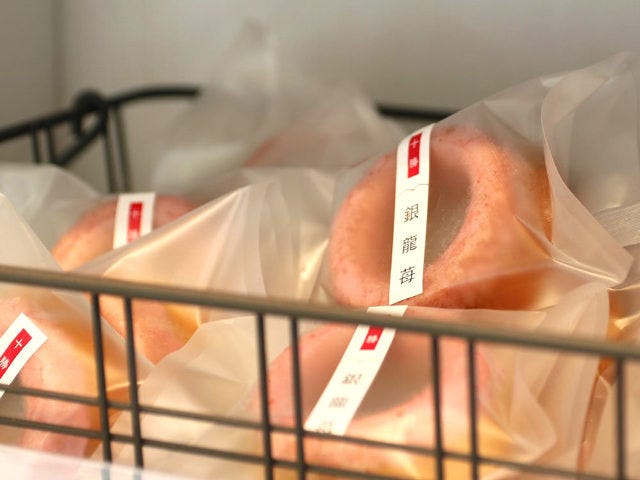 新たに加わった焼き菓子「銀龍苺の焼きドーナツ」と「銀龍苺のスティックケーキ」も見逃せない。手みやげ用に日持ちのする菓子が欲しいとの声から生まれた、イチゴのピュレを生地に練りこんだ焼き菓子だ。焼きドーナツは、ピュレをミックスしたホワイトチョコレートがコーティングされている。プチプチした粒感としっとりとした生地の組み合わせが絶妙だ。
