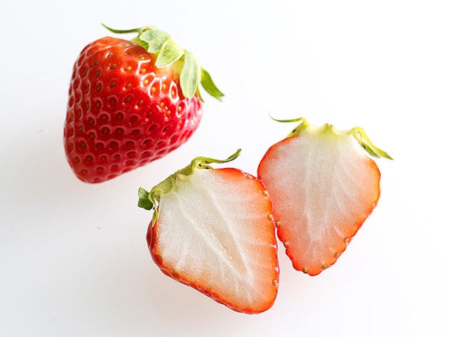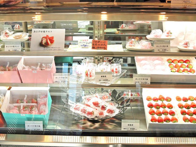 白を基調としたシンプルな店内に一歩足を入れると、イチゴの甘い香りが漂い、思わずうっとりとしてしまう。ショーケースには、生のイチゴだけでなく、スイーツもずらりと並ぶ。栽培から収穫まで、丁寧に一粒ずつ手作業されるというイチゴは、見事に粒がそろい、ツヤツヤと赤く輝いている