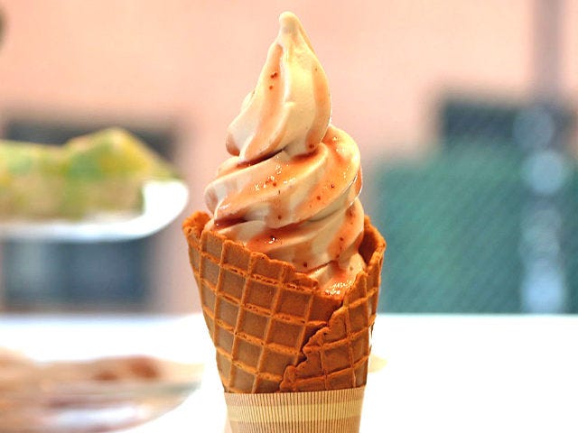 淡いピンク色をしたソフトクリームは、まるでイチゴそのものを食べているかのように濃厚な味わい。ミルクの味もコクがあり、なんとも贅沢な味わいに仕上がっている。