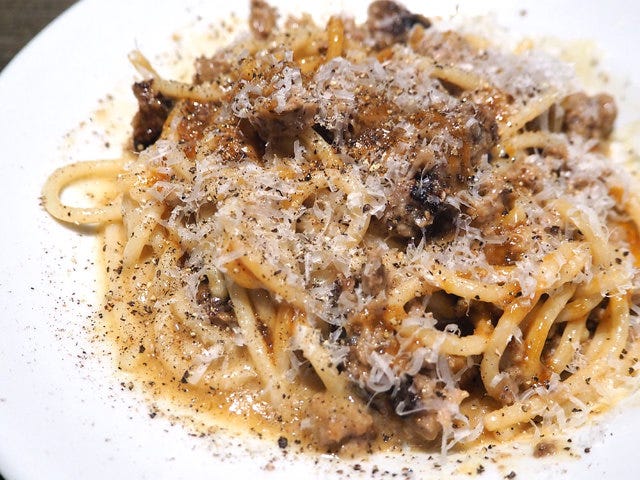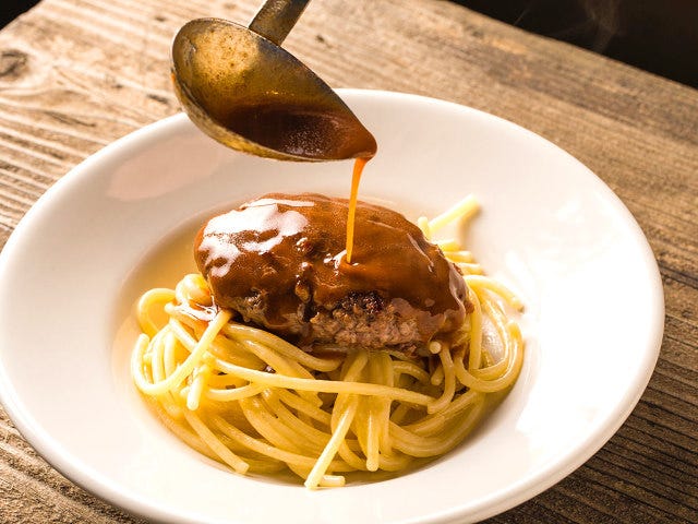 ハンバーグは黒毛和牛の牛挽き肉を使用し、両面を炭と薪で炭で香ばしく焼き付けられている。中に閉じ込められた肉汁は、ほぐされることで徐々にパスタに絡まり、デミグラスソースと渾然一体となる。