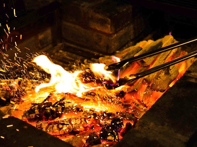 店のコンセプトは「炭トキドキ薪」。炭と薪を使ってさまざまな食材を調理する。厨房全体が見渡せるオープンキッチンに、頭上には薪のストック。カウンター越しに見えるストーブ(焼き場)には赤い炎が揺らめく。