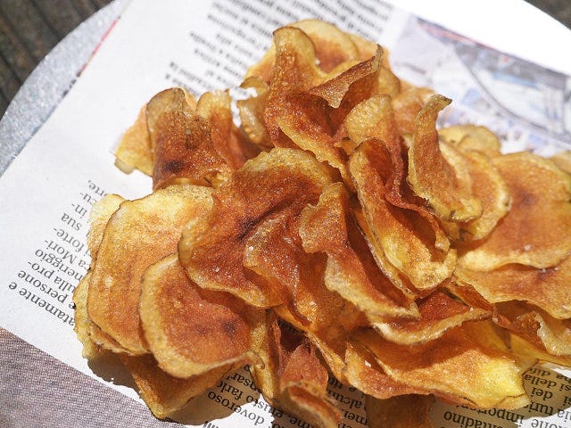席に着くとまず出てくるのはお通し代わりの「ポテトチップス」(写真上)。こちらはじゃがいも「インカのめざめ」を0.5mmほどにスライスし、カリッと揚げた一品。