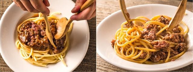このハンバーグをお客の前で崩し(写真上)、ソースとチーズ、コショウを使ってミートソーススパゲッティに仕上げていく。