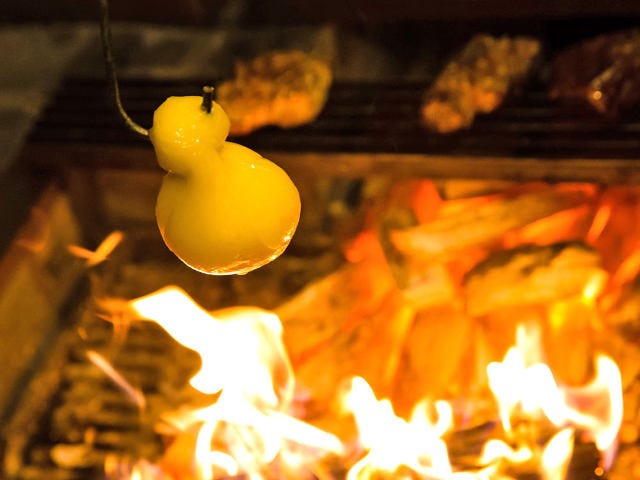 ひもにぶら下げたカチョカヴァロを薪の炎の上に吊るし(写真上)、ゆらゆらと振り子のように回しながら表面を加熱。とろとろになった状態を、炭火で焼いたパンにのせていただく。チーズの塩気と甘み、炭の芳ばしい香りのついたパンのバランスが絶妙だ。