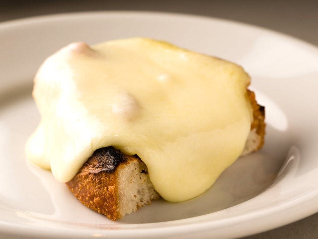 ひょうたんのような形のチーズが炎でとろとろに。香ばしいパンと共に味わおう
