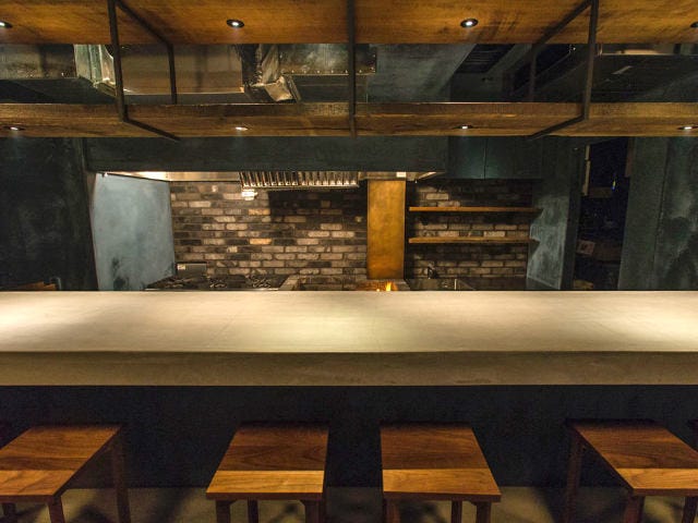 黒をベースに作られた空間だが、揺らめく炎とほどよくマッチする古木材を多用。手洗い部分には生成りののれんを配し、スタイリッシュさの中にもあたたかみをもたせた内装に仕上げている。