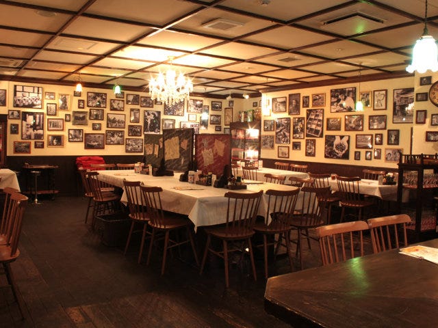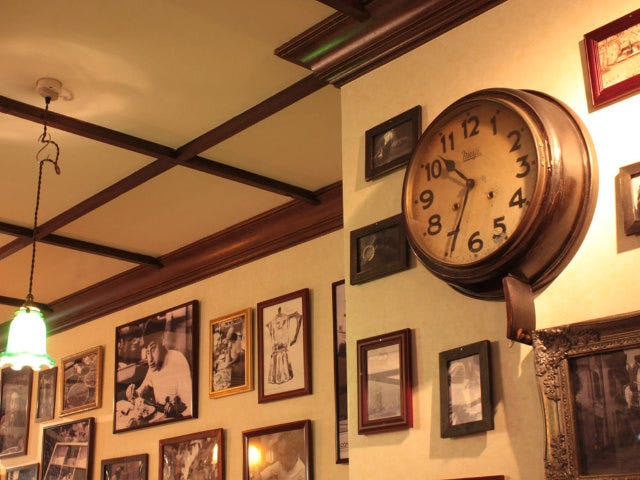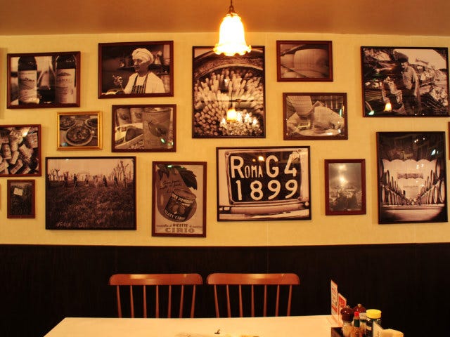 さらに奥へ足を進めると、そこは昭和レトロな空間。壁いっぱいにかけられた、古いイタリアのものらしき風景や人物の白黒写真。その人物写真の多くが「スパゲティをほおばっている姿」であることに気づき、ついほほ笑んでしまう。