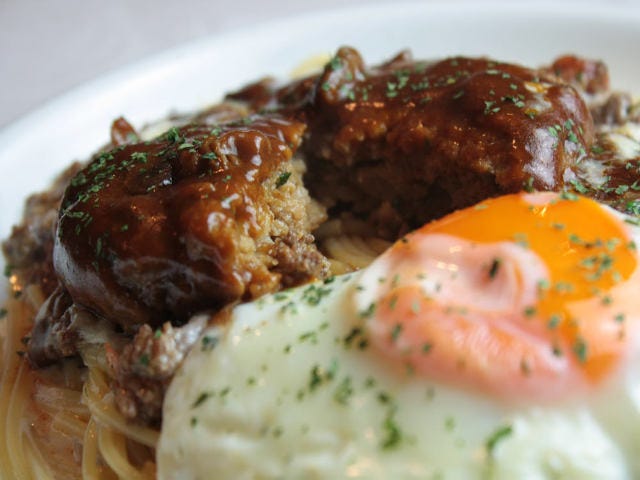 ハンバーグに絡めてあるのはデミグラスソース。麺を食べ進めるときは、ベースのミートクリームソース、デミグラスソース、さらに半熟の黄身、と3つの味をそれぞれ楽しむもよし、組み合わせてももよし。パンチのきいたひと品だ。