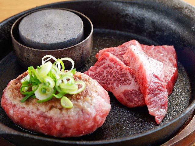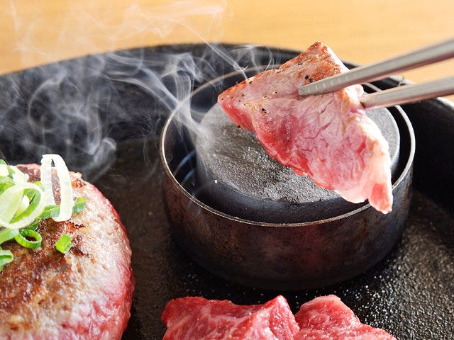 ステーキもハンバーグと同様、焼き石にのせて好みの焼き加減でいただく。サシが入っており、噛むほどにジューシーな甘みが口の中に広がる。