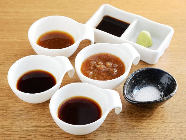 ソースは甘めでご飯が進む「極味やのタレ」、肉本来のうまみが深まる「肉醤油」、さっぱりとした味に柚子胡椒をアクセントとして効かせた「柚子胡椒ポン酢」、肉の甘さが増す「ヒマラヤ岩塩」、ワサビの風味が活きる「わさびしょうゆ」、たまねぎの甘みとニラの風味がマッチする「オニオンソース」の6種類。思わず全種類試したくなるほどだ。