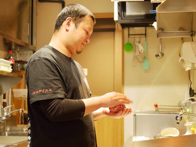 「まずは何もつけずにお召し上がりください」と平島さん。パクリと口を運んでみると、肉本来の濃厚なうまみが口いっぱいに広がる。さらに、つなぎを使用していないため引き締まった弾力感があり、肉々しさをダイレクトに感じることができる。
