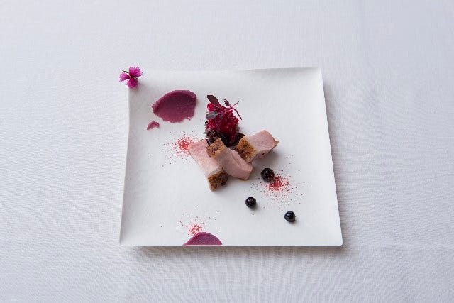 醤油かすに漬け込んだ、やわらかくジューシーなイベリコ豚のローストが主役の一皿。