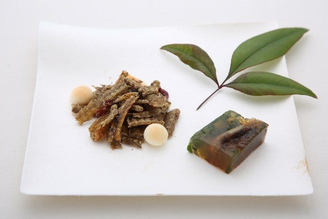 戯曲・ハムレットの登場人物になぞらえたという店主の遊び心が光る鰻のゼリー寄せと、同店の名物・骨せんべいのコンビネーション。異なる食感がユニークな一品だ。