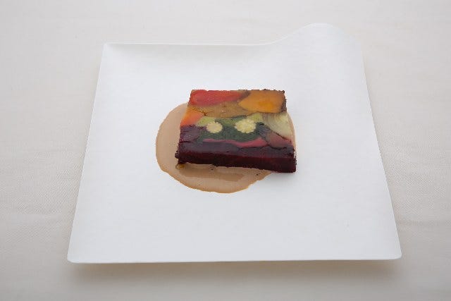 10種類の野菜をそれぞれ異なる調理法と味付けでテリーヌに。見た目も春らしい一品。