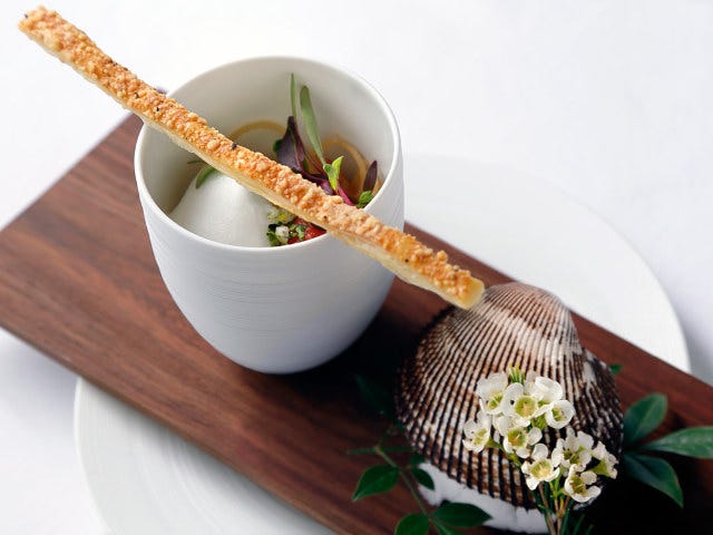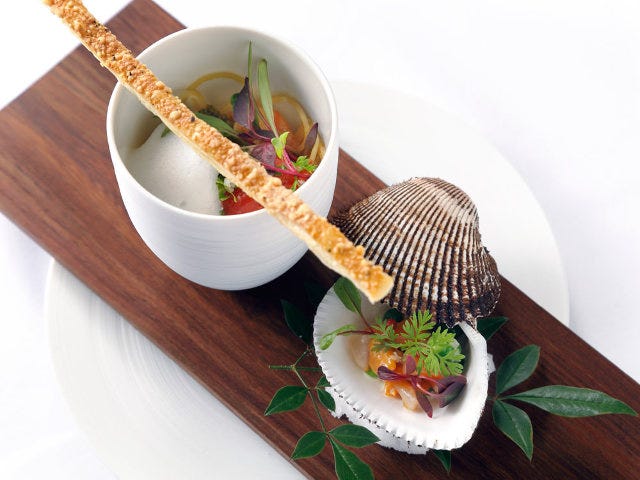 想像以上のサプライズで歓迎されたあと、供されたのは湯呑み茶碗に貝殻、チーズ風味のパイが並ぶ「活け赤貝のスパゲッティ イタリア産 唐墨」(写真上)。次は何が起こるのだろう……。ちょっぴり身構えるお客に向かって、浅見シェフは「貝を開いてみてください」と囁く。