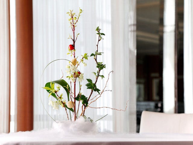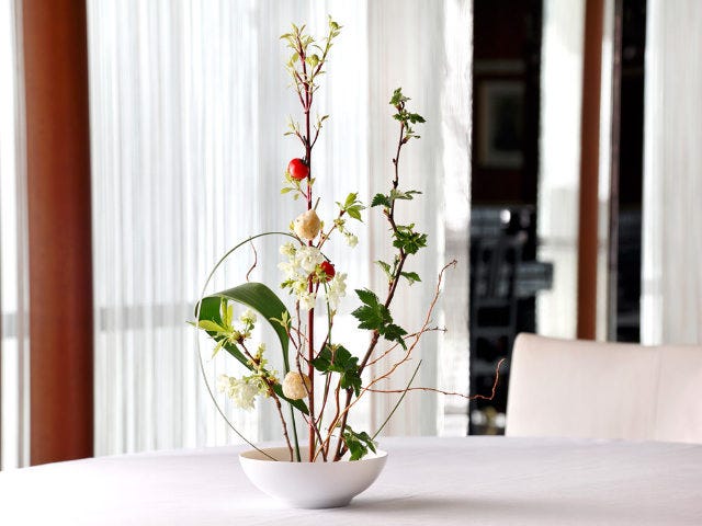 現れたのは、春の草花が咲き誇るひと皿(写真上)。水の中に剣山を忍ばせた様子は、まるで生け花のよう。その美しさに見惚れていると、ショーはこれからですよ、と言わんばかりに、浅見さんがニヤリと笑って皿に仕掛けを施す。
