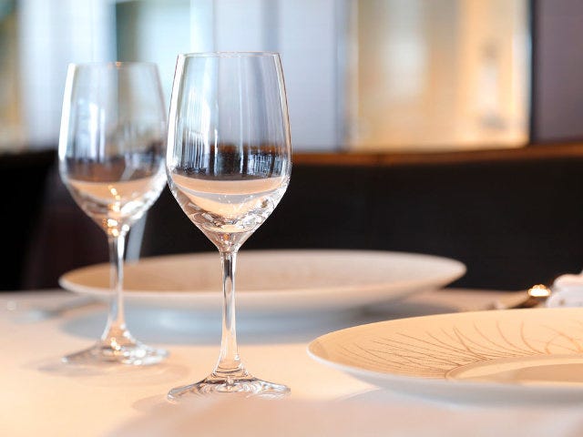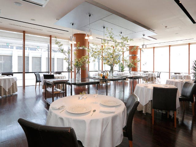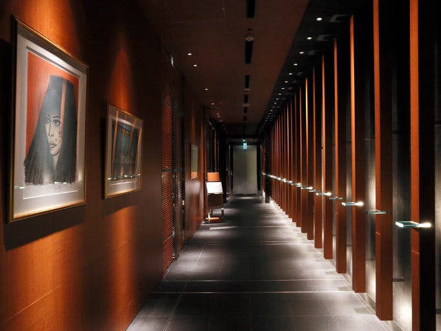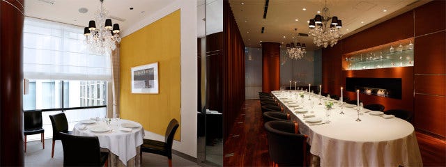 8階へ上るガラス張りのエレベータからの眺めは、高級ブティックへ行き交うマダムの姿など煌びやかな景観で眩しい。辿り着くと一転。シックに灯る光の回廊が、これからはじまる食事への期待をあおる。