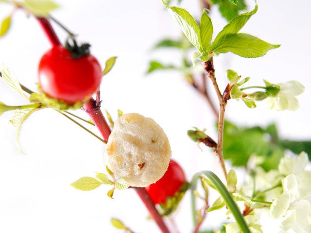 「さぁ、収穫してみましょう!」。浅見シェフの声に合わせて、皿に顔を寄せてみると、木苺の葉にかくれんぼする2つの食材を発見。