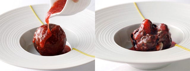 瞬く間に溶けだし、中からたっぷりのイチゴと冷たいマスカルポーネのムースが顔を出す。酸味と甘み、水分のバランスが整った福岡県産あまおうは、ほろ苦いチョコレートと口内で乳化して甘みをグッと引き立たせたあと、グラッパのきいたソースとからんでオトナなスイーツに表情を変える。