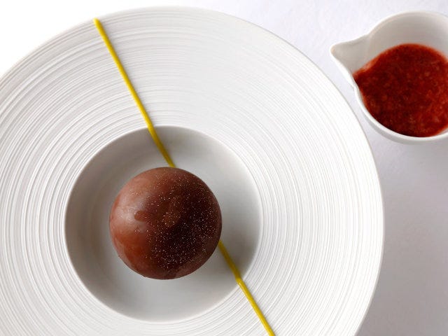 見目麗しいドルチェは、チョコレートの球体に同店のコンセプトである銀箔をあしらった「苺のピアット 濃厚なマスカルポーネ」(写真上)。
