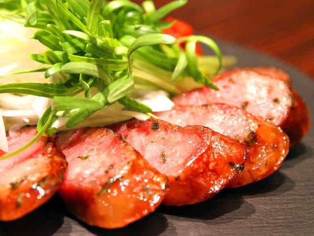 ワインと相性が抜群な「美虎 自家製 腸詰め」(写真上)も見逃せない。宮崎産の「おいも豚」の甘みを引き立て、セロリの葉も加えて蒸した後、表面をバーナーで炙った芳ばしさが食欲をかきたてる。